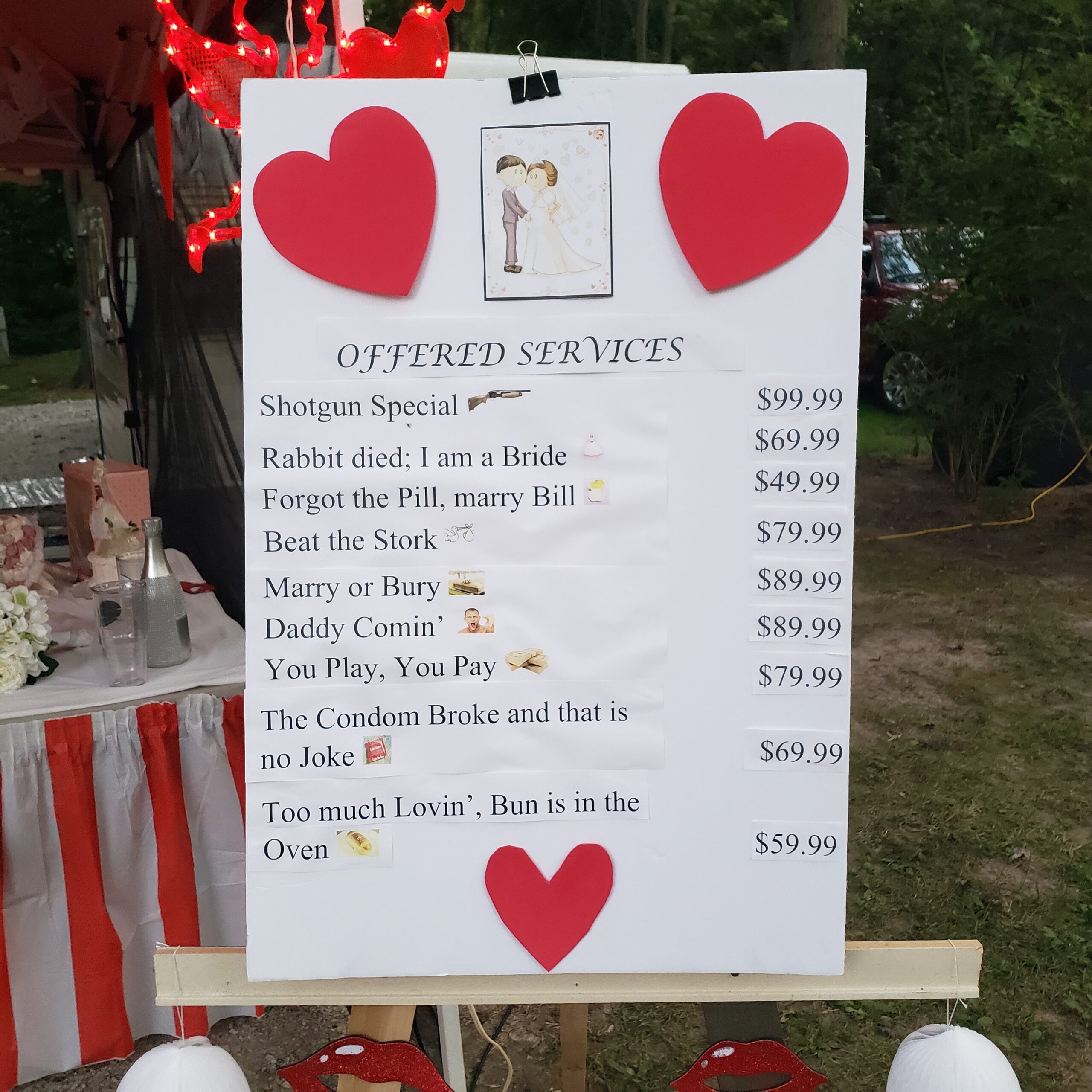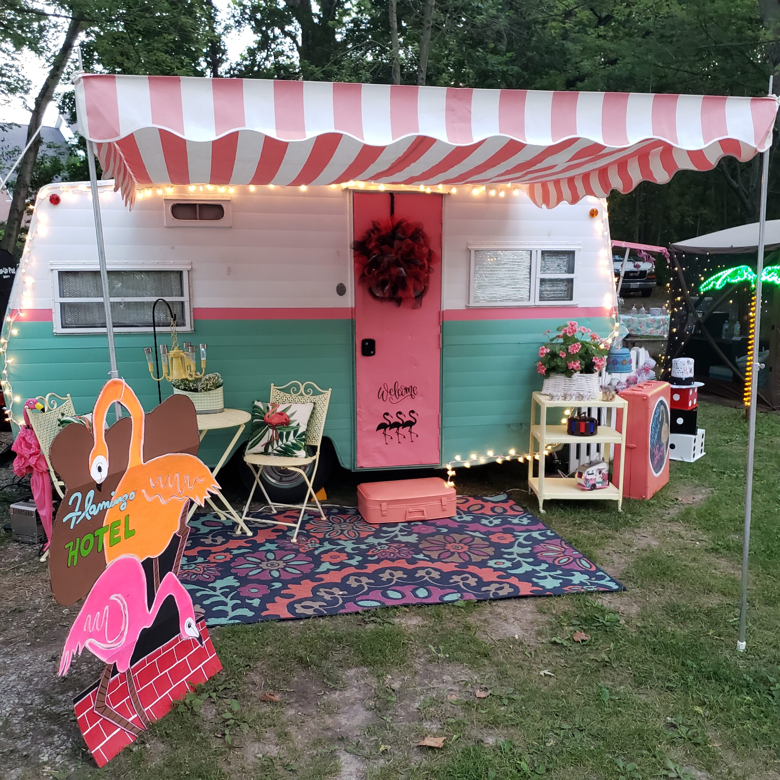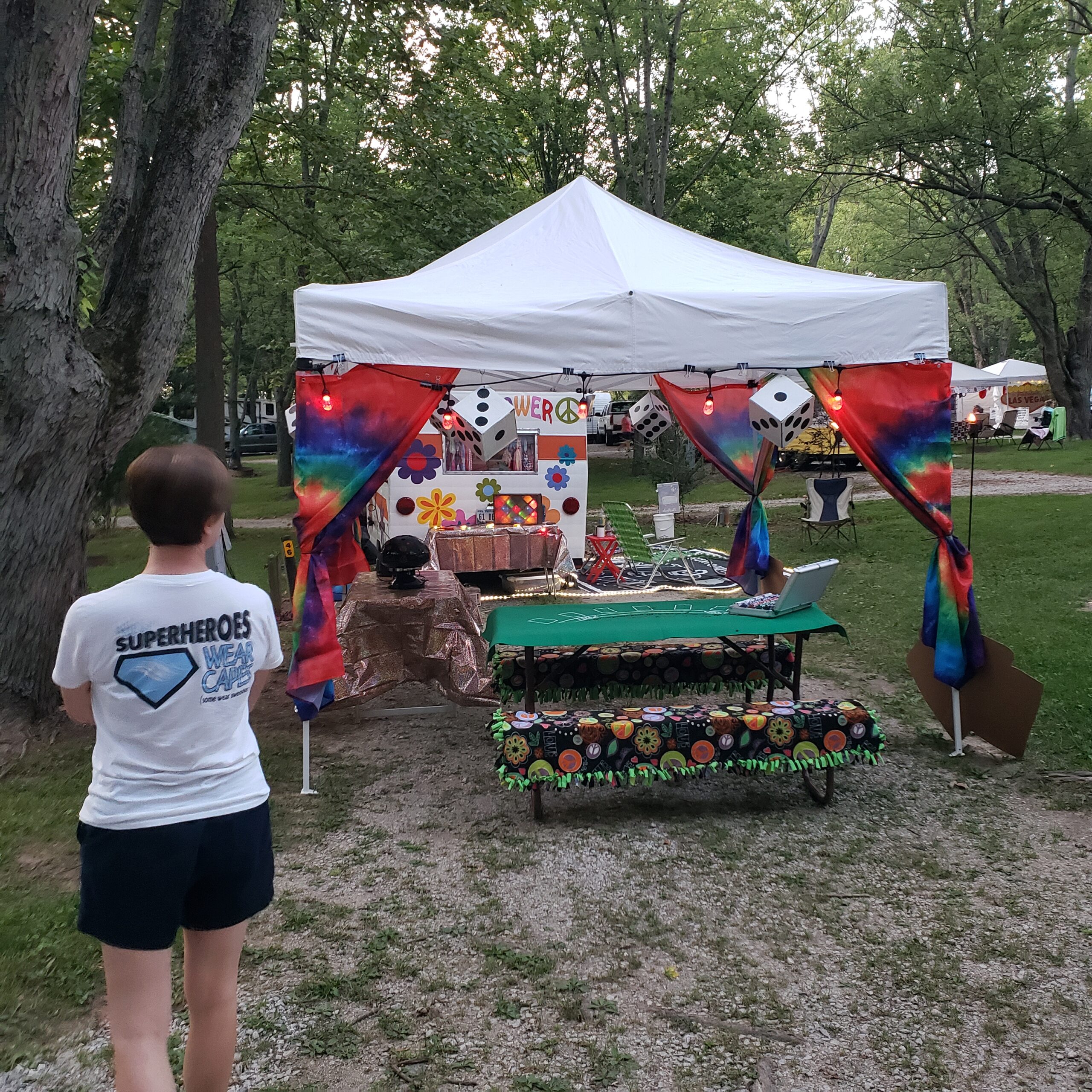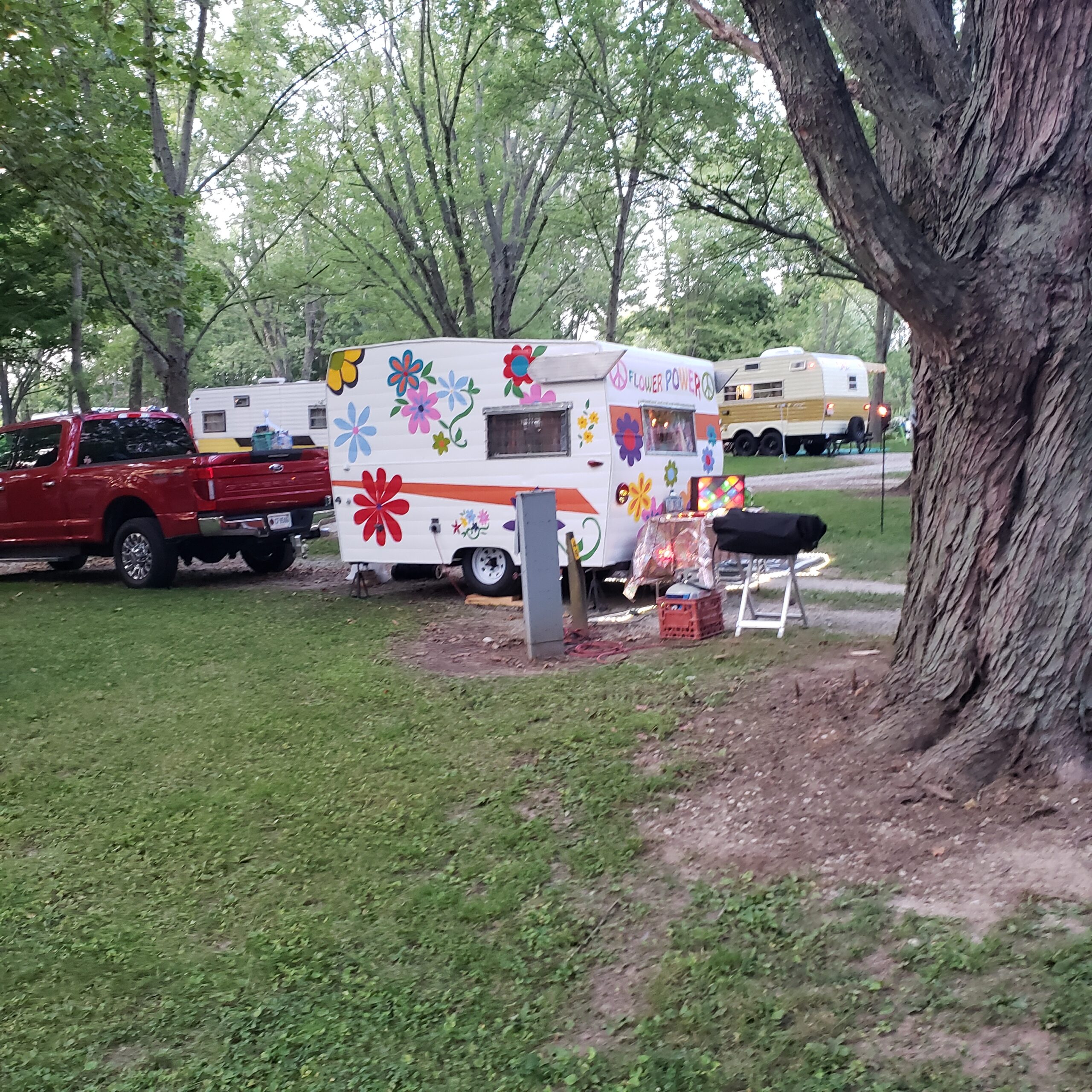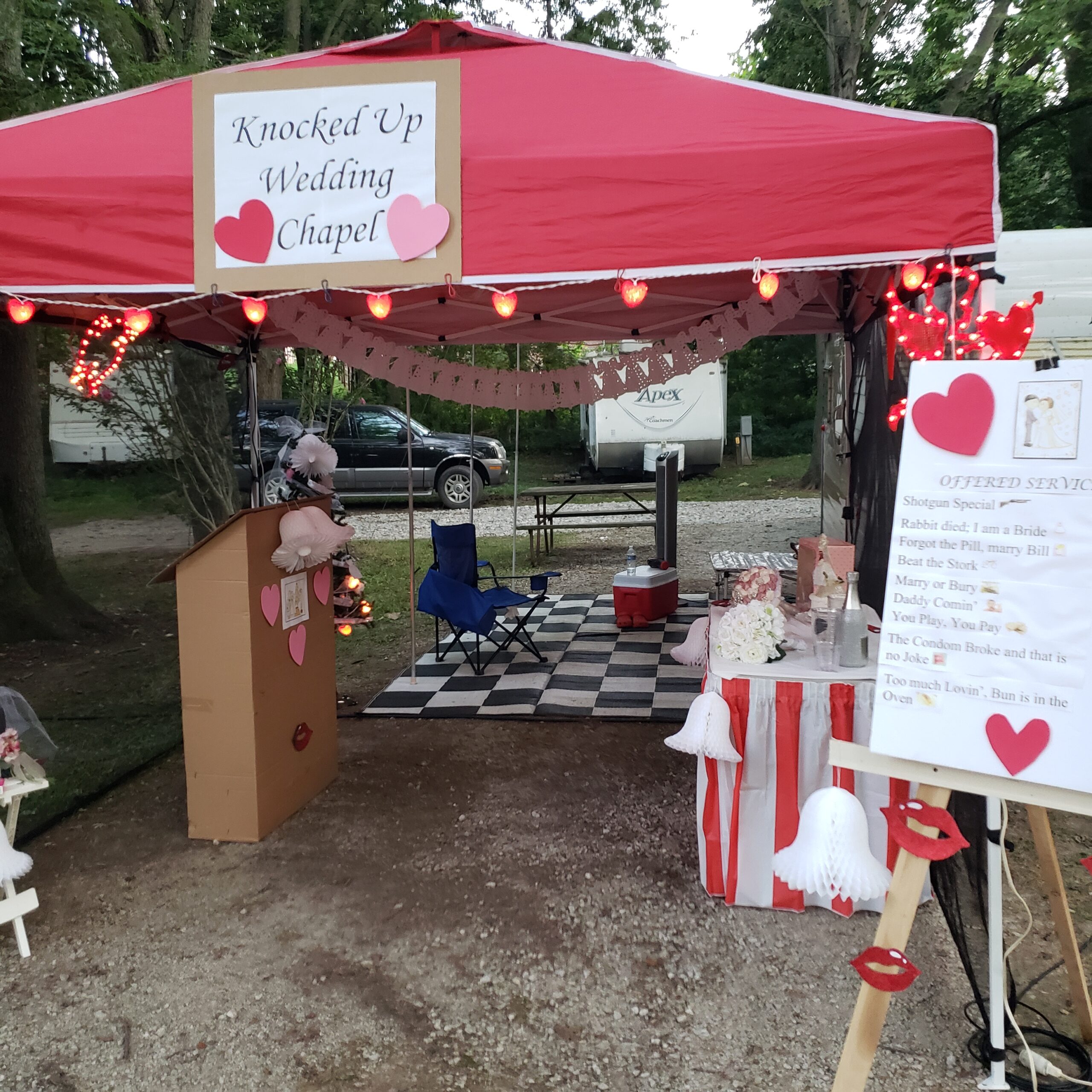 Last night we stayed in Crawfordsville, IN at a lovely little KOA tucked just off I-74W. They were hosting a vintage camper gathering with a High-Roller Casino night theme. The Husband snapped a few pics of a makeshift “wedding chapel” next to one of our vintage brethren with a full menu of services offered. Another camper was painted with a classic 60s-style flower-child theme. It was a fun diversion for a much-needed evening walk before we headed to bed early.